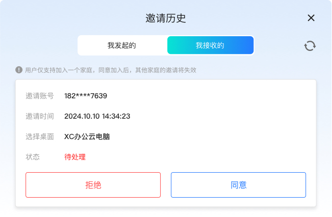 2.家庭成员也可前往“家庭管理”-“邀请历史”-“我接收的”,按需选择AI云电脑进行加入即可。