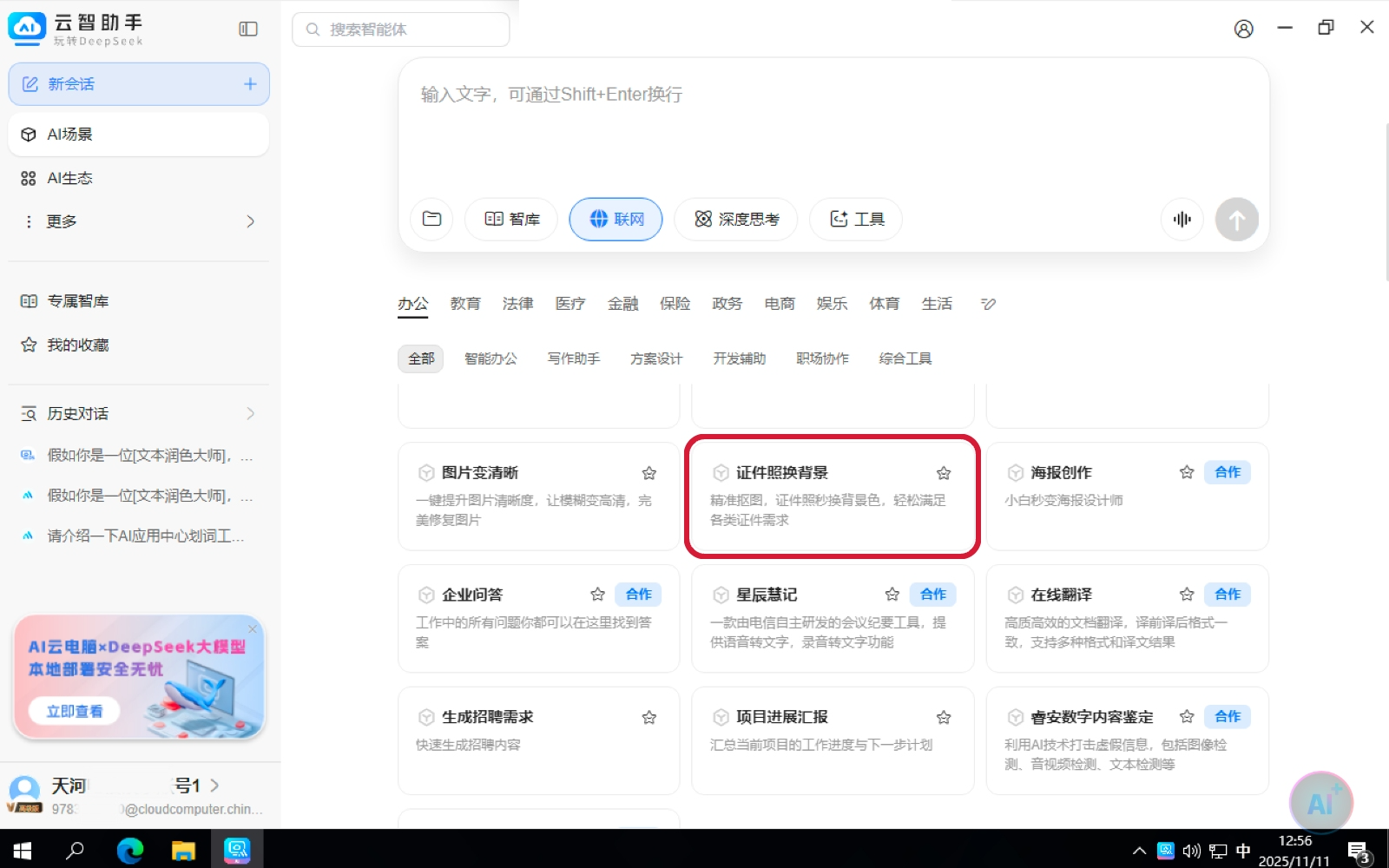 2.在云智助手的菜单选择“应用”-“办公”-“证件照换背景”;