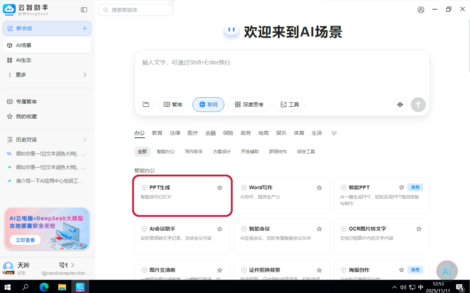 2.在云智助手的菜单选择“应用”-“写作助手”-“PPT生成”;