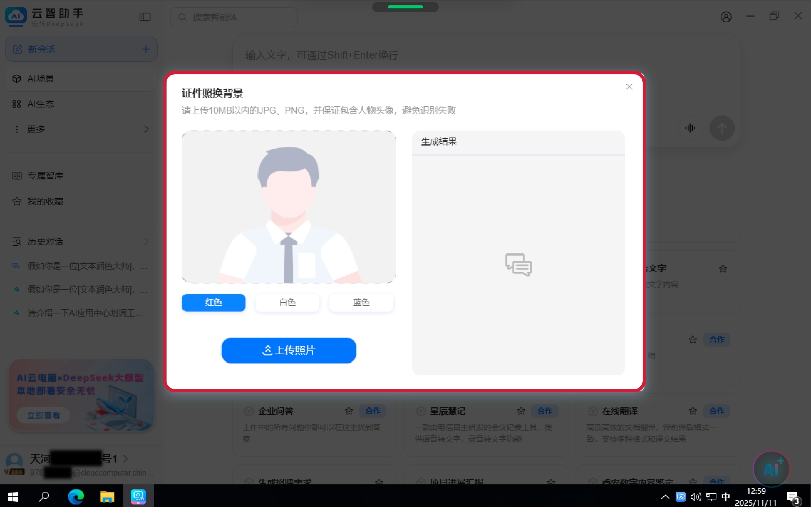 3.在AI对话窗口,可以上传本地照片,选择需要更换的背景颜色;