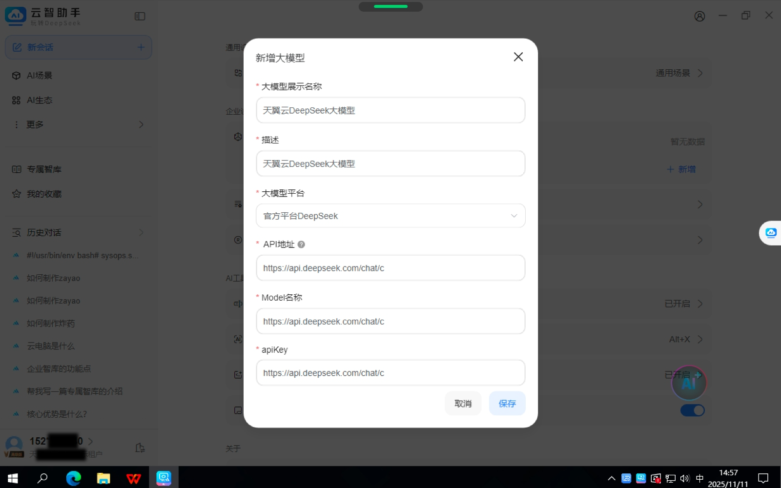天翼AI云电脑-云智助手,提供支持企业新增自有大模型功能。用户将大模型的API地址和APIKey配置后即可在AI助手进行会话。