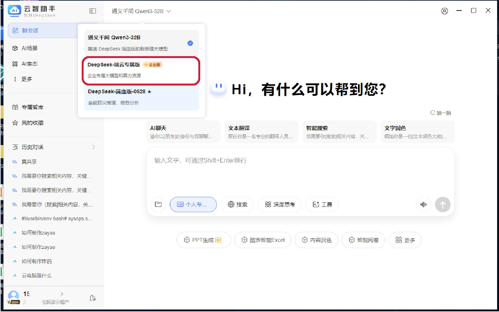 4.自有大模型添加后,企业用户在AI助手会话时,可选择自有大模型进行聊天,开启专属大模型智能体验。