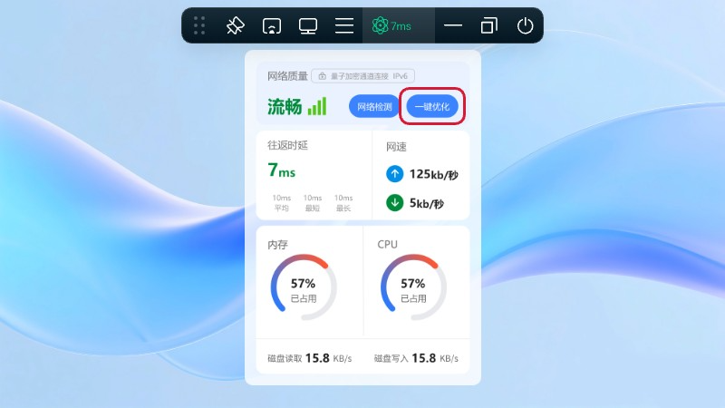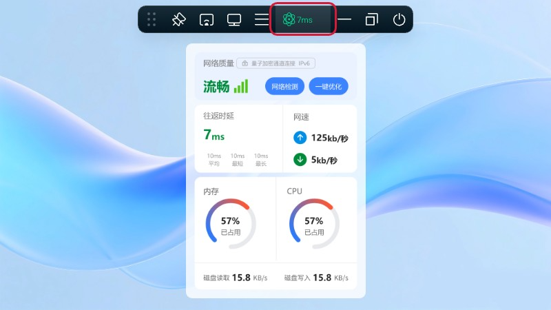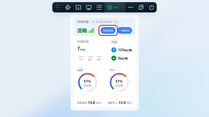 点击“网络时延”。可以查看详细的网络状态:往返时延,网速上下行、内存占用、CPU占用、磁盘读取/写入。