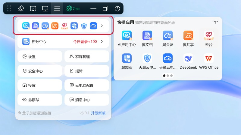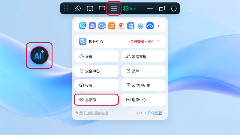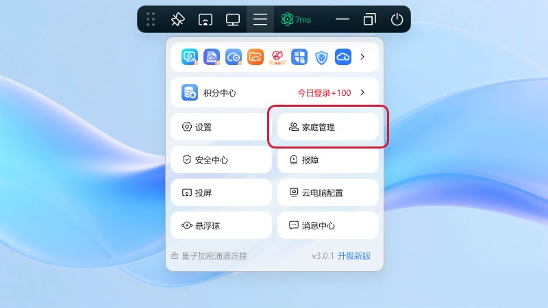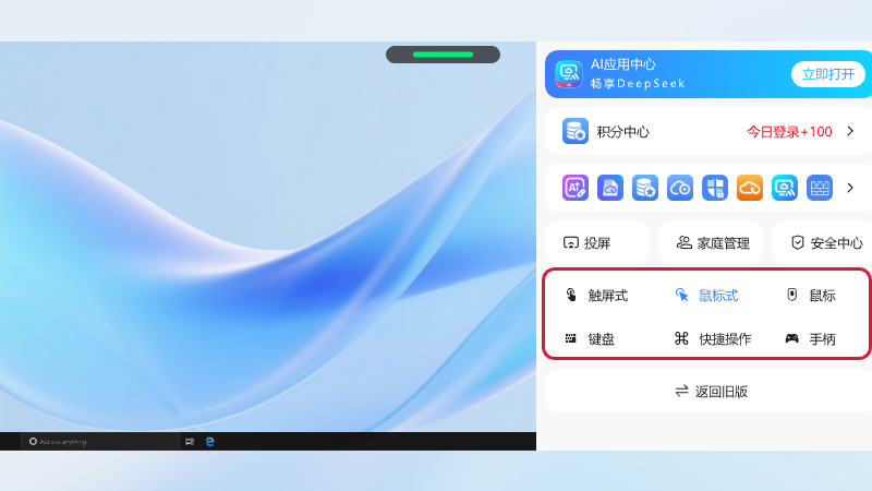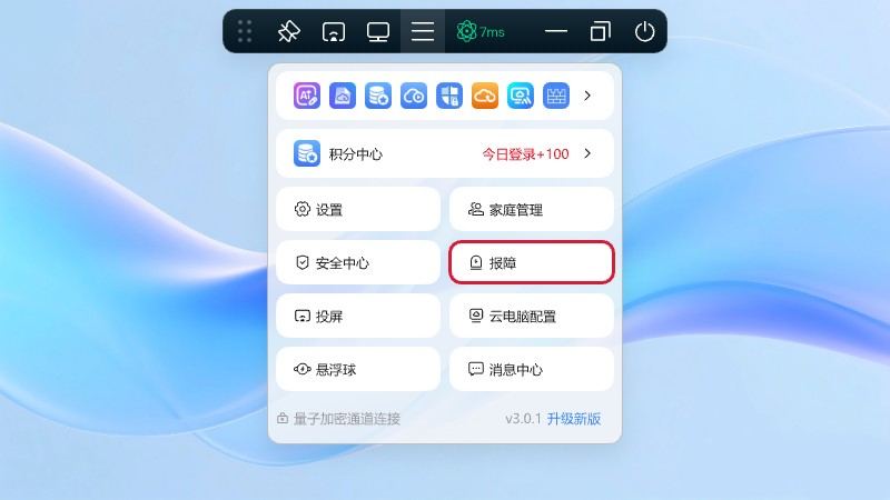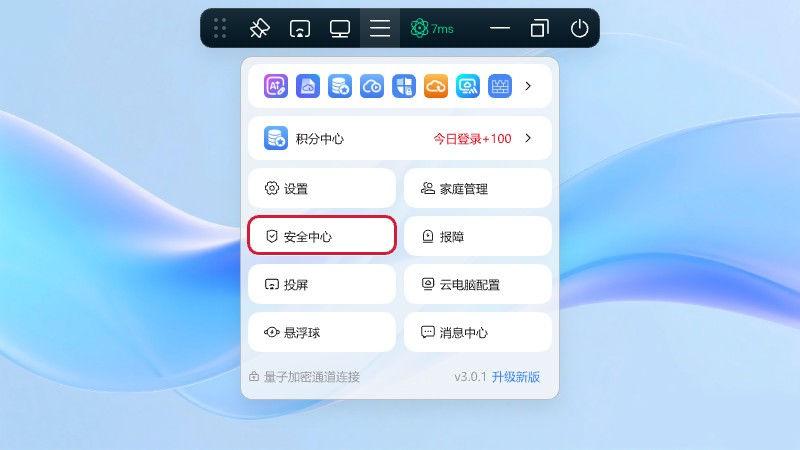 工具栏-点击“控制中心”面板,可以看到快捷应用、积分中心、设置、家庭管理、安全中心、报障、投屏、AI云电脑配置、悬浮球等功能入口。