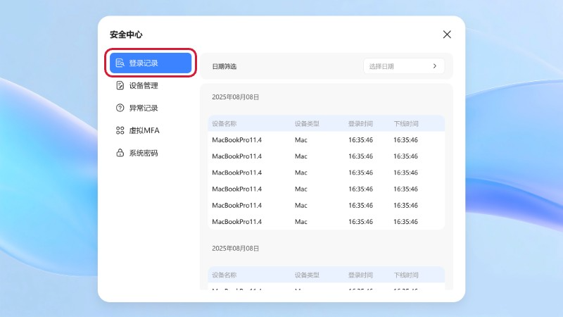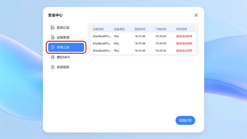异常记录:如登录AI云电脑更换了新设备或者更换了城市,首次登录会提示异常记录。