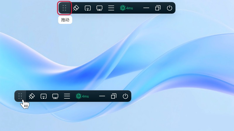 进入AI云电脑后,可在桌面顶部看到工具栏,点击“拖动”图标,支持工具栏任意位置移动,支持隐藏在桌面顶部和左右两侧屏幕边。