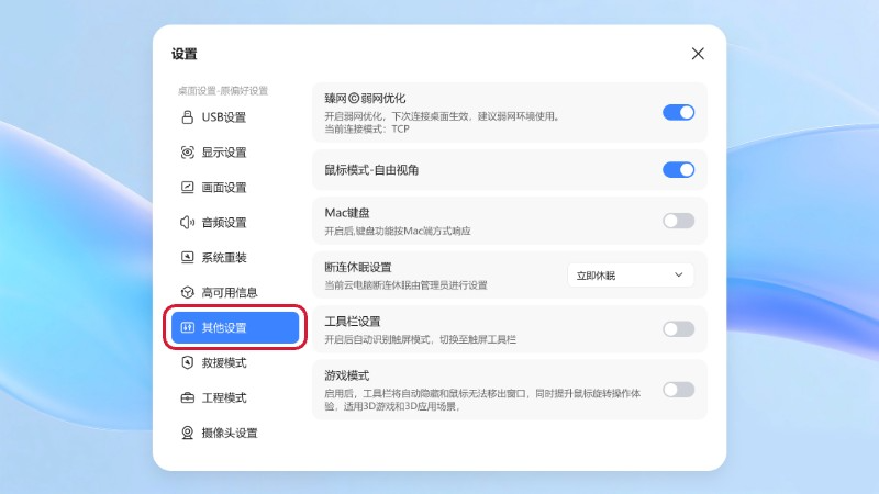 臻控©弱网优化:网络环境较差时,在桌面内工具栏-偏好设置-其他设置中打开“臻控©弱网优化”开关,退出桌面再重新进入生效,可以提升AI云电脑使用流畅度。