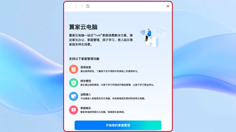 “翼家”默认对天翼量子AI云电脑(公众版)开放,家长可通过手机号邀请成员或管理员加入家庭管理。组建家庭关系后,家长和管理员可对家庭成员AI云电脑查看学习、绿色管控、远程接入、解绑AI云电脑等操作,详细见翼家帮助文档。