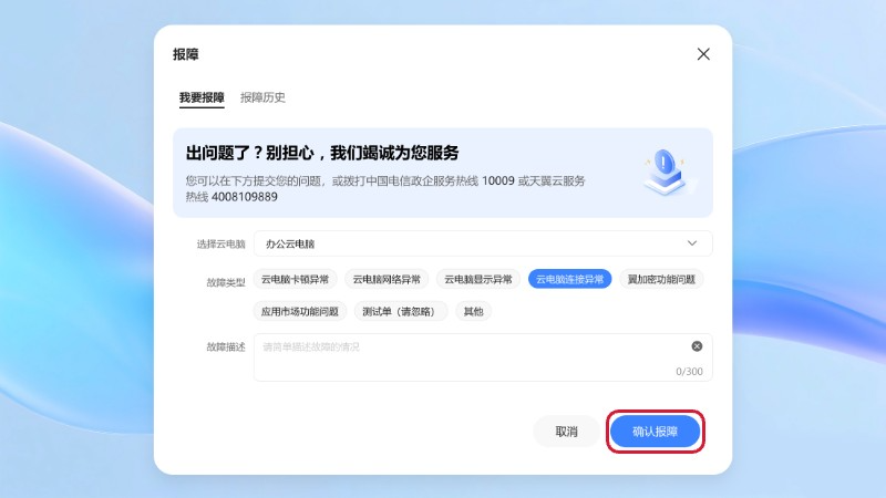 使用AI云电脑过程中,如遇到问题,可点击“报障”,填写故障信息或者拨打服务热线:400-810-9889。