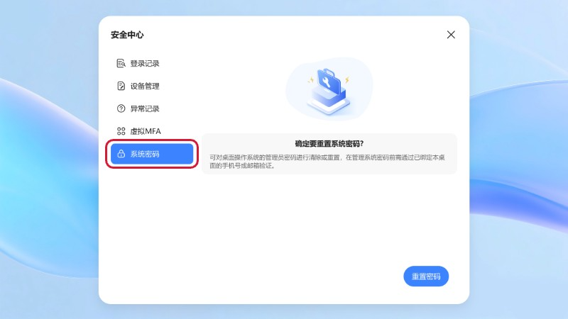 忘记AI云电脑系统密码时,安全中心-点击"系统密码"进行重置系统密码。