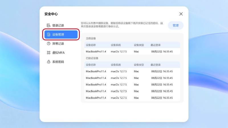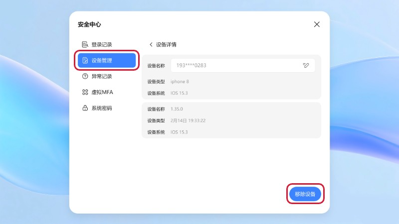 设备管理:如需查看AI云电脑登录的设备或移除设备,用户中心-点击“安全中心”,选择“设备管理”。