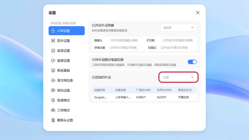 如需管控外设或者查看外设重定向策略,进入偏好设置,点击“USB管理”,可以管控USB重定向设备。