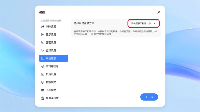 如需系统重装,偏好设置-点击系统重装,选择“系统盘重装至初始状态”,进行系统重装,系统重装会将系统还原至初始状态,系统盘的程序或数据会被清除,如非特殊情况,否则不建议使用。