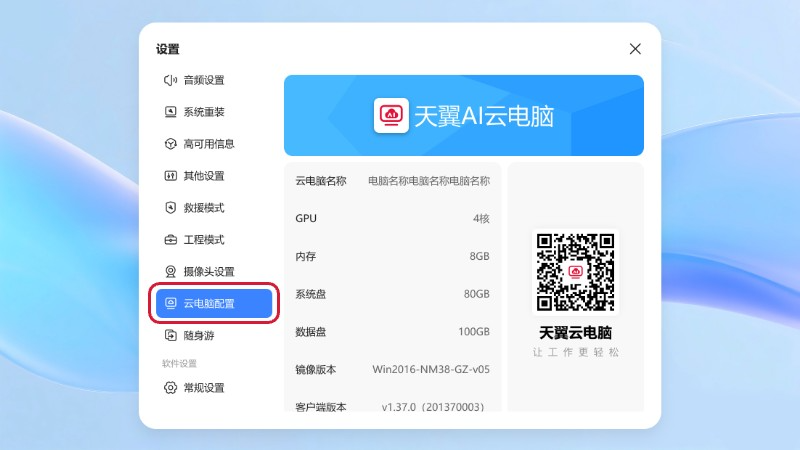 控制中心-点击“AI云电脑配置”,查看AI云电脑的配置信息。