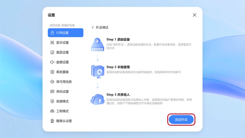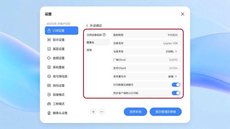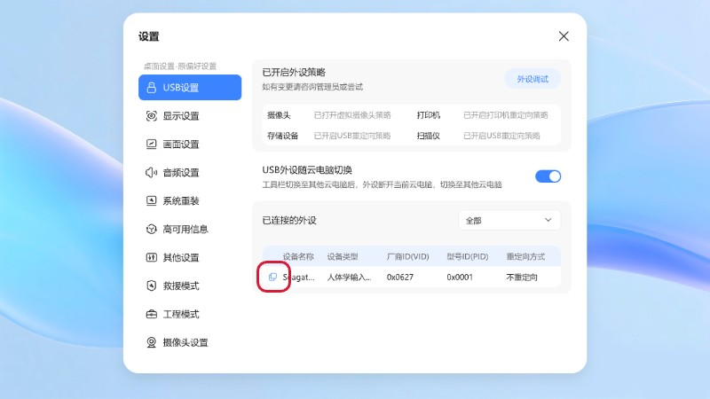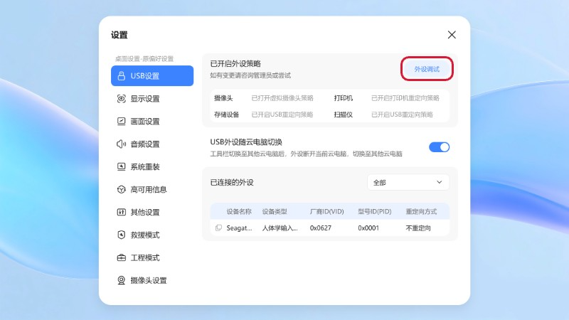 若有无法识别的外设,在客户端-工具栏-设置-选择“外设调试”,选择当前连接的外设,配置设备类型,选择重定向方式。