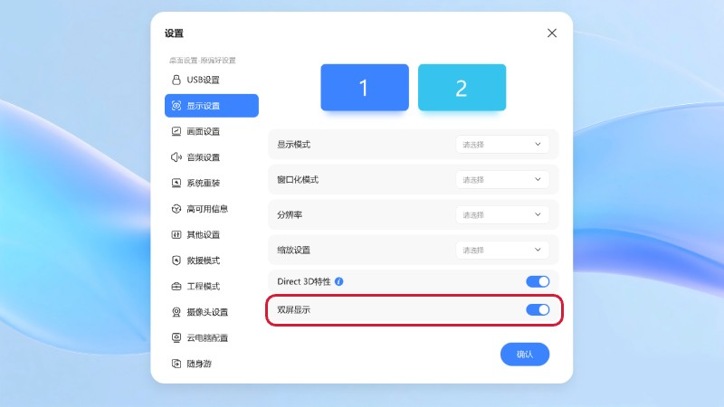启用“双屏显示"后,支持一个桌面在2个显示屏幕上扩展显示,满足用户在主副屏幕上协同办公。