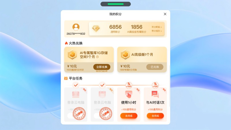 “AI云电脑积分中心”权益管理功能,面向公众、政企版AI云电脑用户,提供积分领取、兑换能力,详情请体验积分中心。