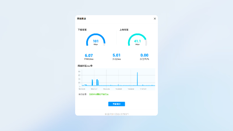 点击“检测网速”,可以检测当前网络的下载带宽,上传带宽,网络时延,抖动,丢包率,以及过去的网络时延变化统计。