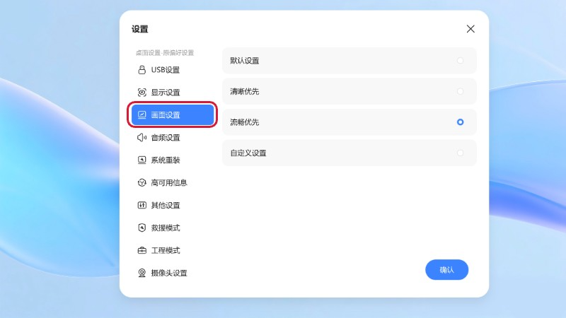 如需设置AI云电脑画面,可选择“默认设置”,“清晰优先”,“流畅优先”,“自定义设置”。