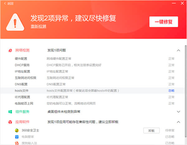 体检完成后,点击【一键修复】,工具将对异常项进行自动修复,显示最终修复情况。(注意:用户【忽略】的异常项,工具将不对其进行修复。部分异常若被忽略(如忽略网络模块中的硬件问题),将导致该模块的其余项目无法正常检修,建议谨慎操作。)