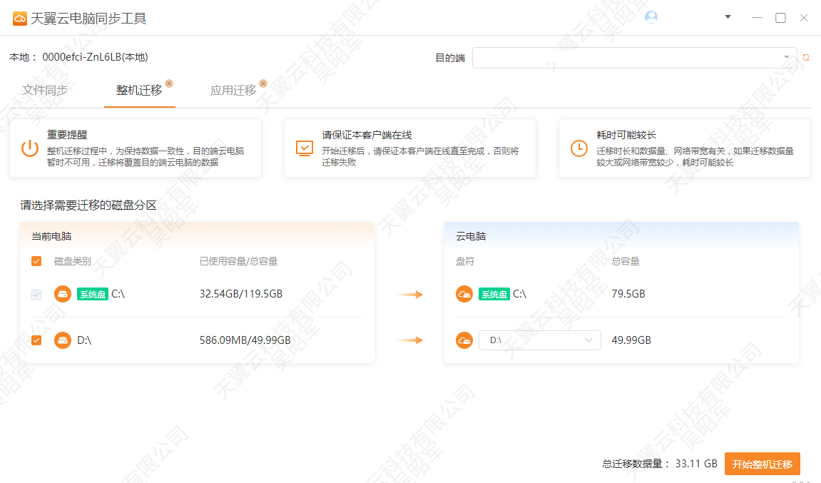在“整机迁移”页面,选择用户的目标AI云电脑和磁盘迁移配置,系统盘默认勾选,不可取消。点击“开始整机迁移”按钮启动整机迁移。