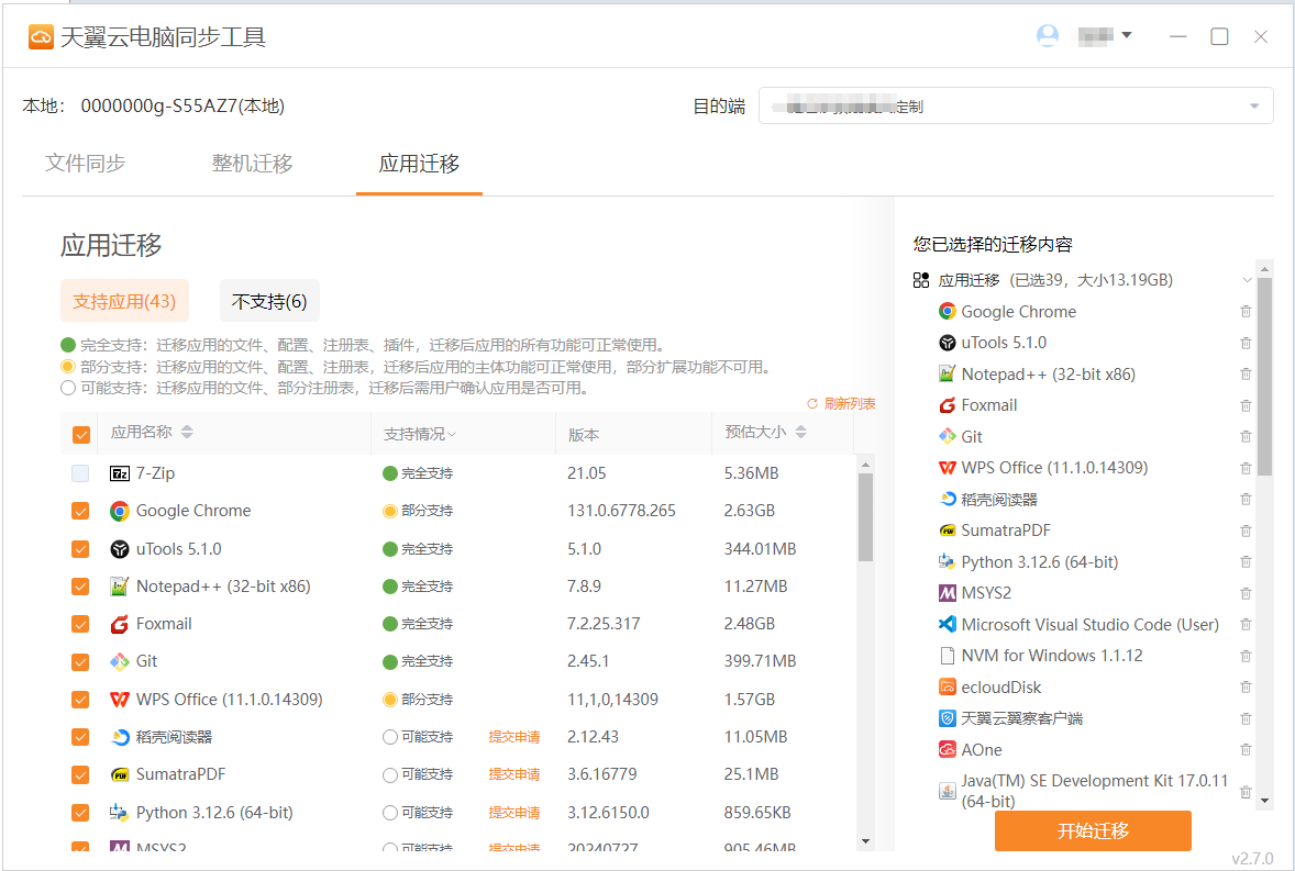 在“应用迁移”页面,在支持迁移的应用列表中,勾选需要迁移的应用。点击“开始迁移”按钮启动应用迁移。