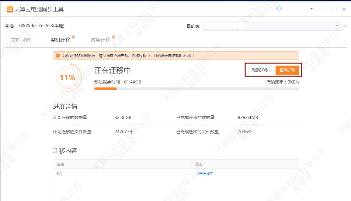 在“整机迁移”过程中,只可点击“取消迁移”或“暂停迁移”,其它操作全部被禁用。点击“取消迁移”进行取消迁移任务后,才可以进行其它操作。