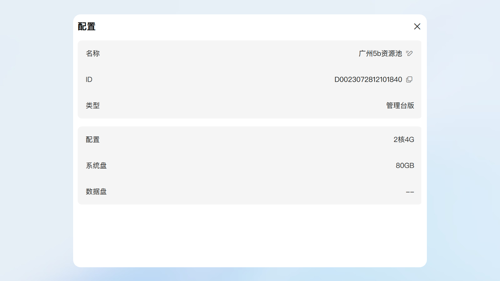 在卡片/列表视图,点击“配置”,查看AI云电脑信息ID、名称以及修改名称、AI云电脑的CPU、内存、系统盘、数据盘配置等信息。