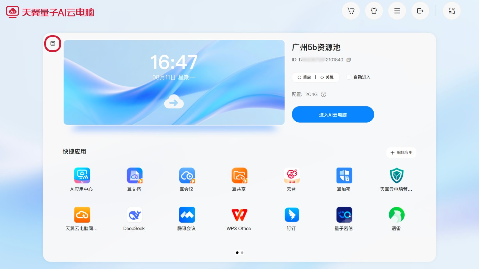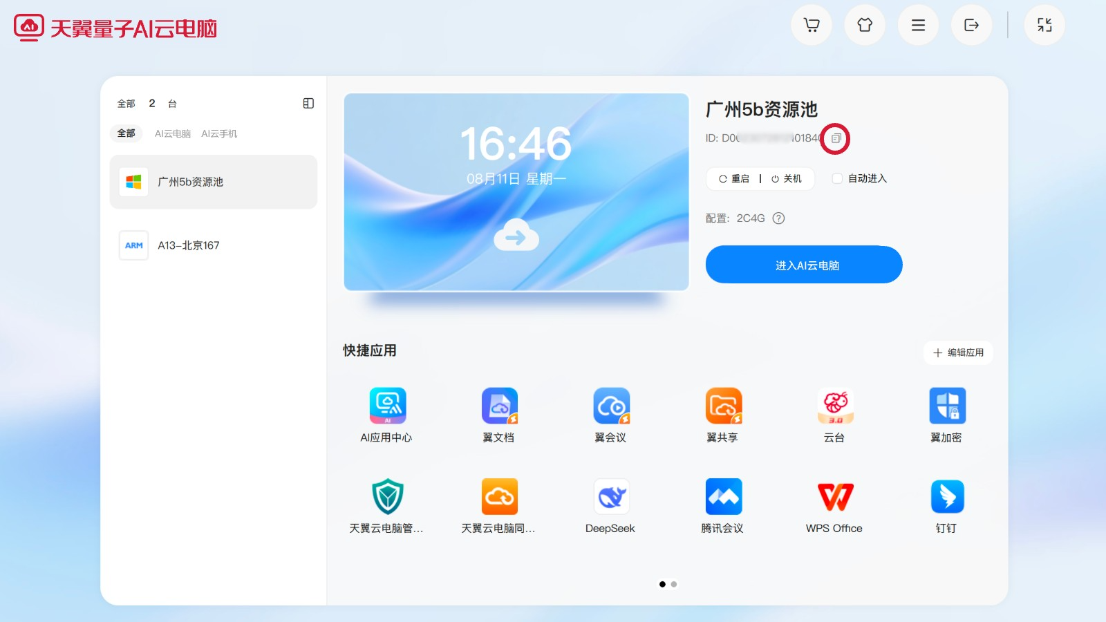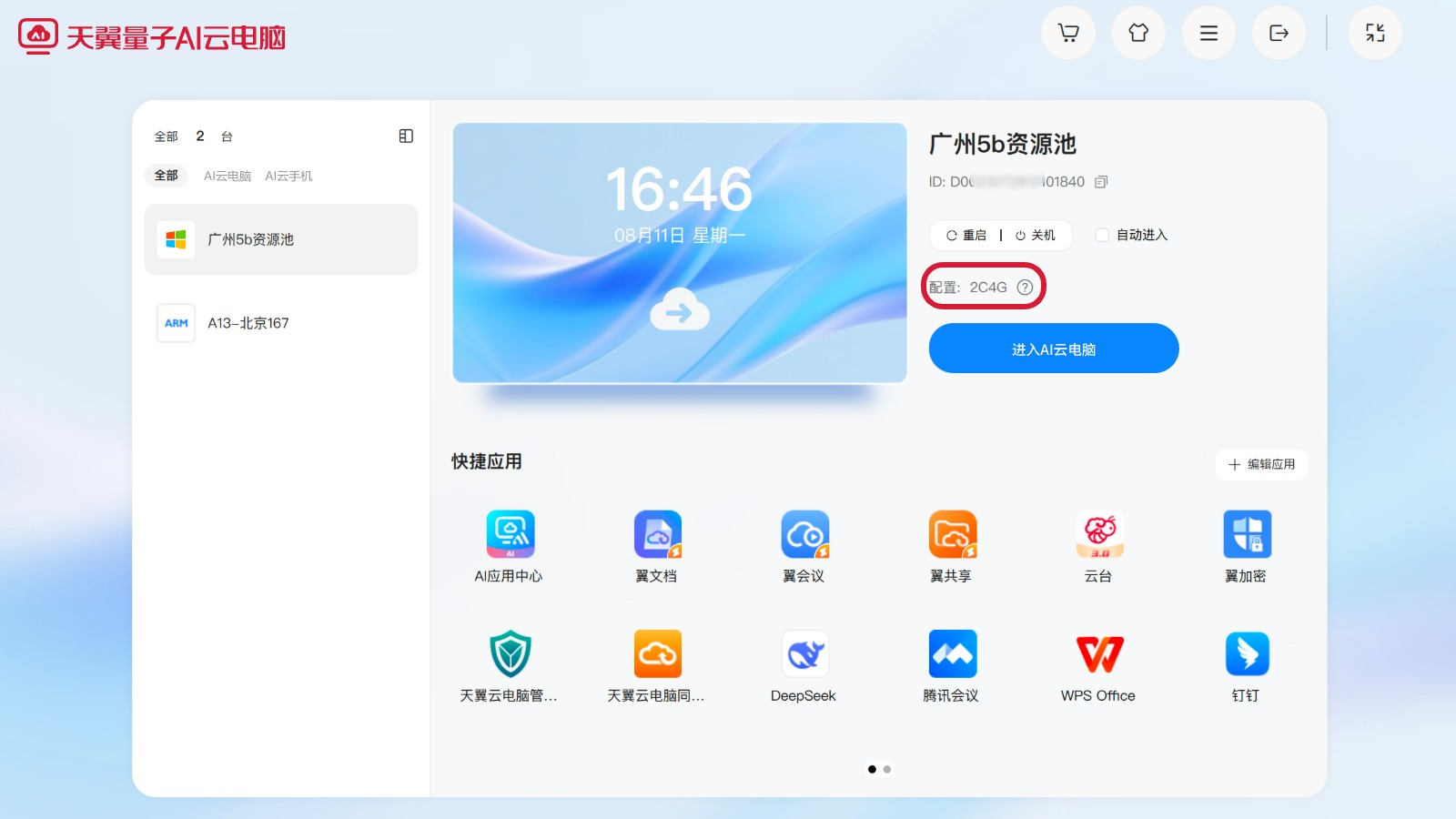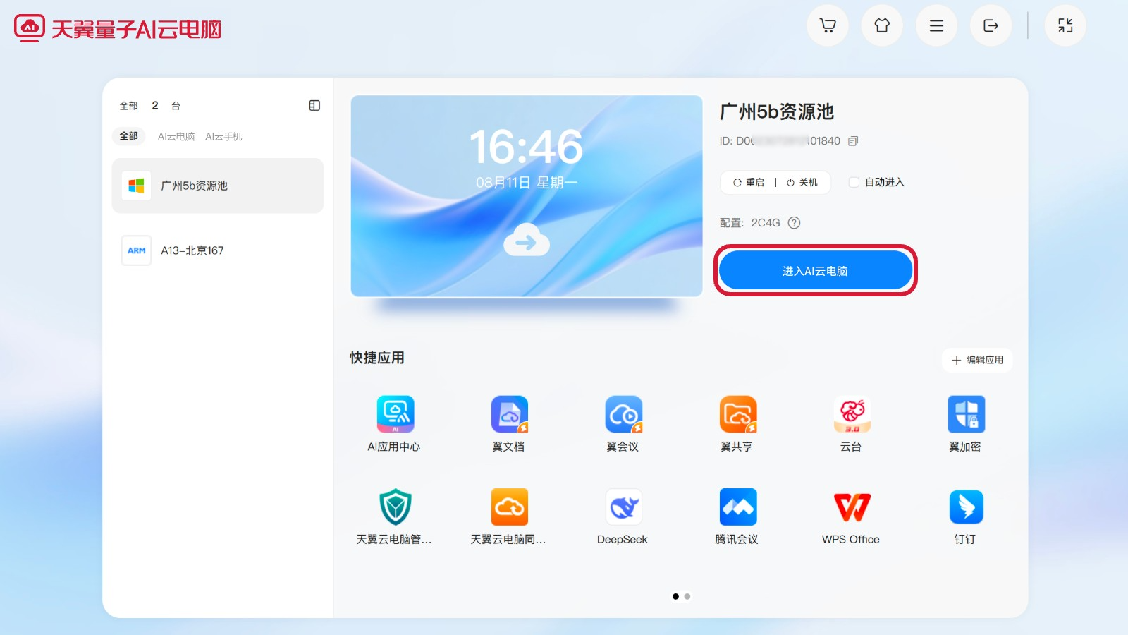 在卡片/列表视图,点击“进入AI云电脑”按钮进入AI云电脑。