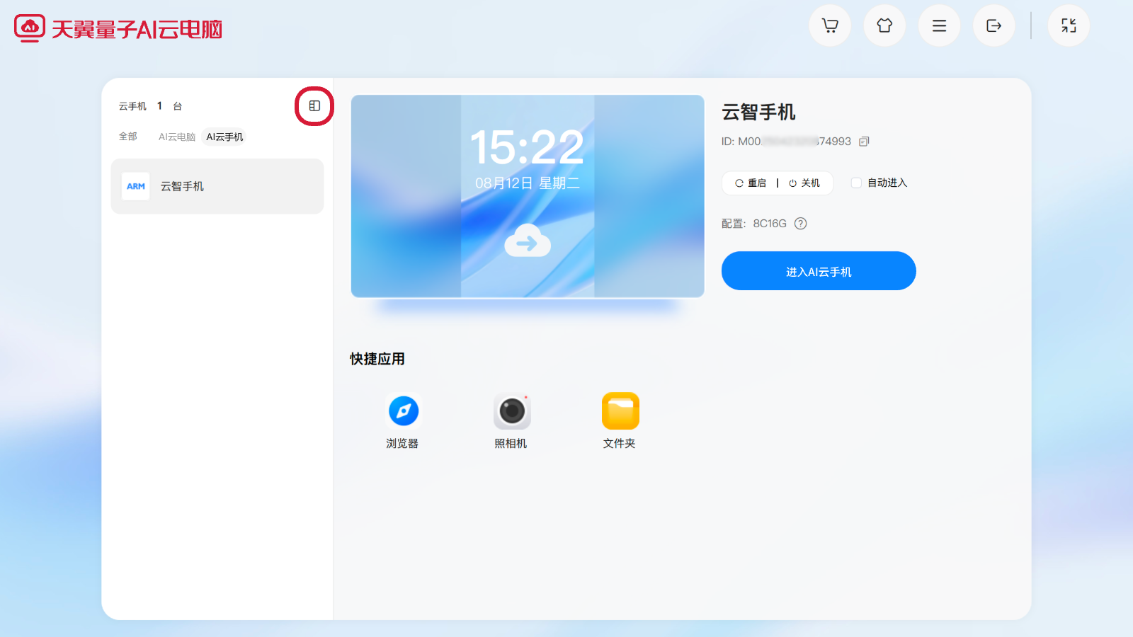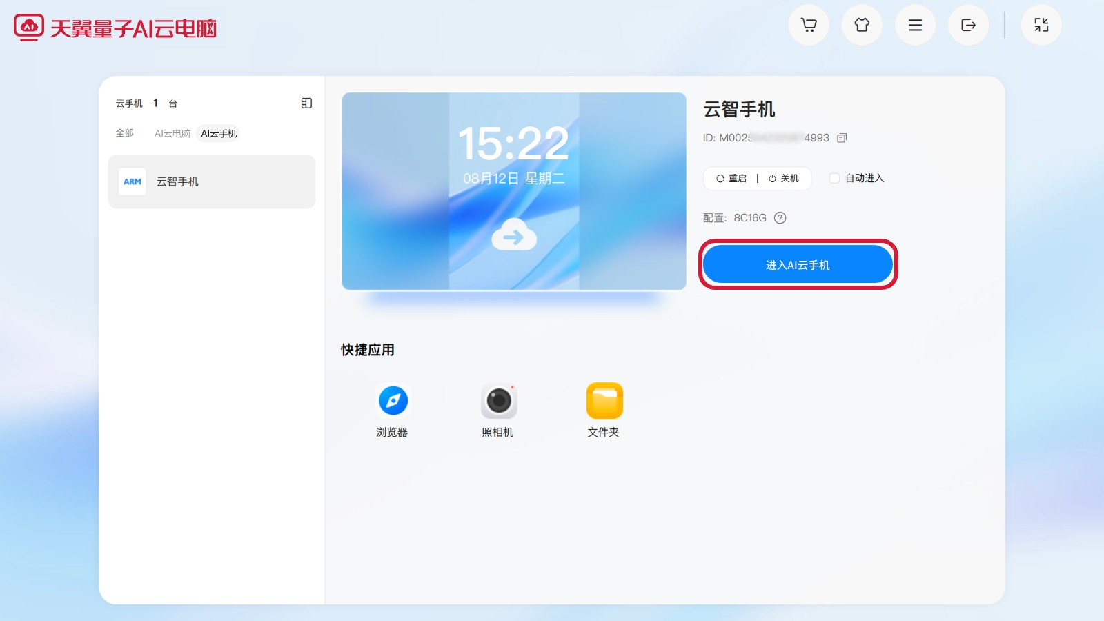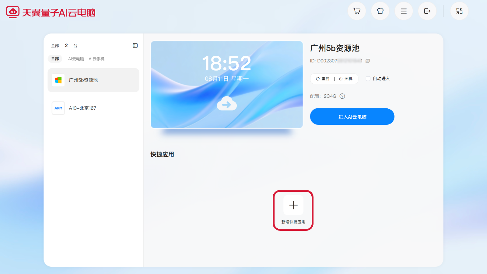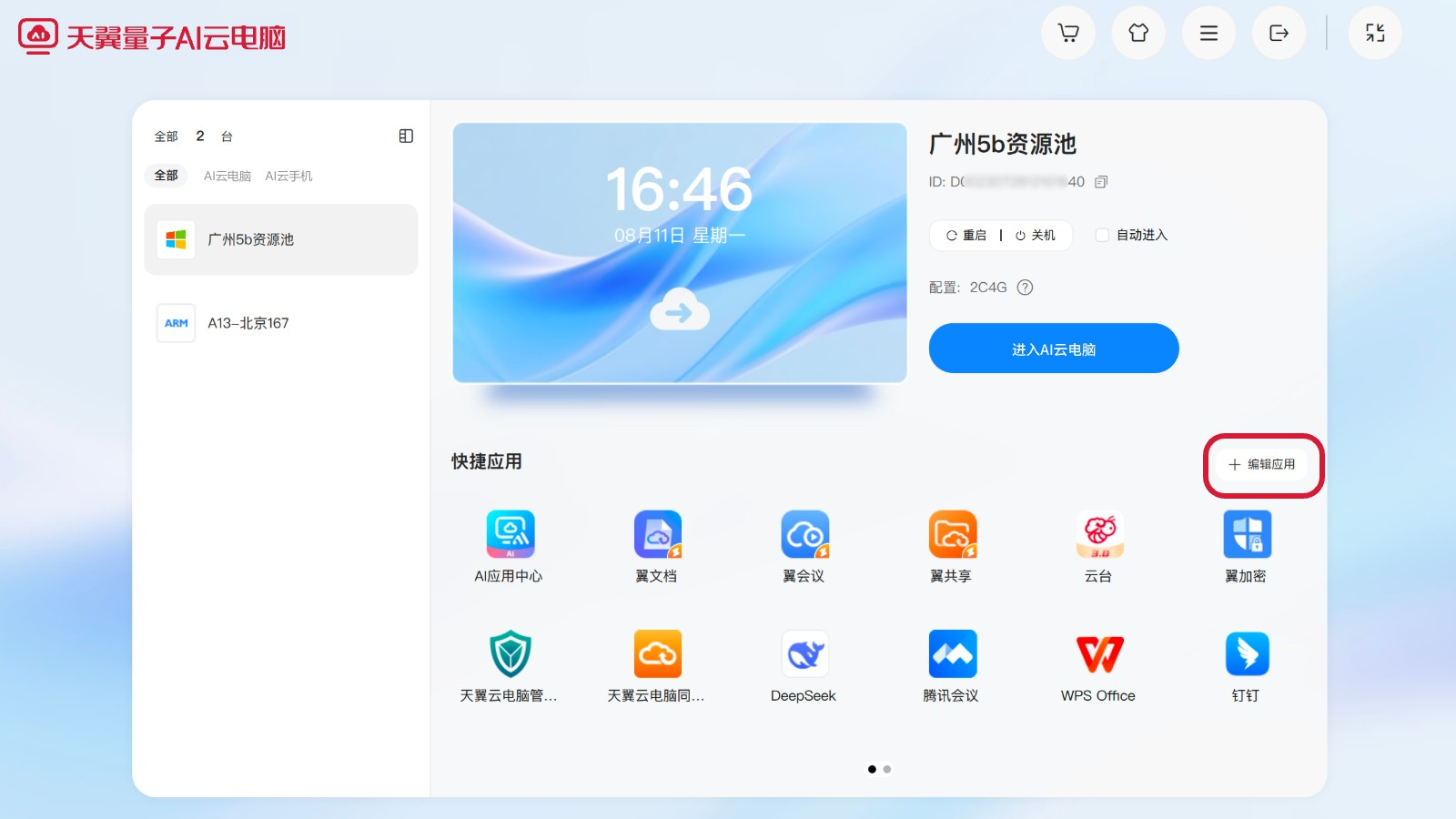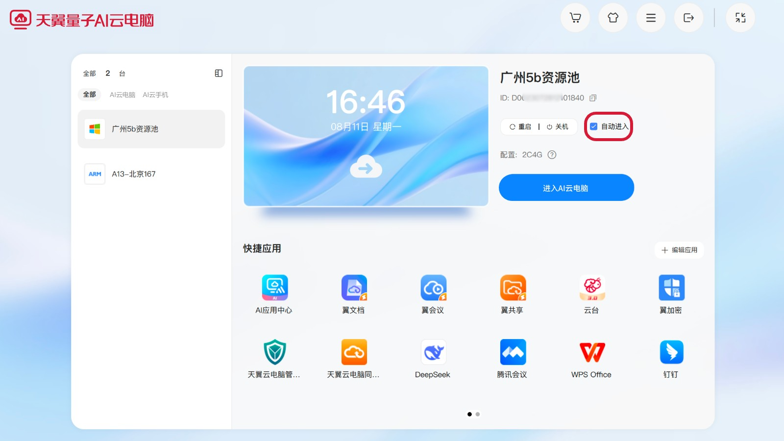 在卡片/列表视图,点击“进入AI云电脑”按钮进入AI云电脑。