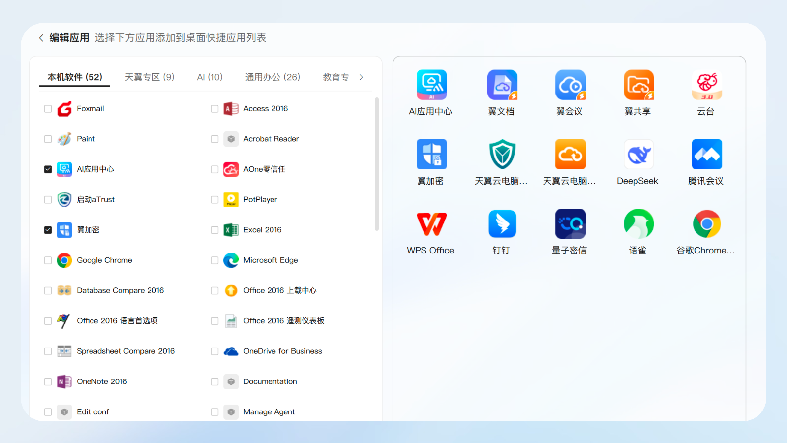 添加/编辑快捷应用:快捷应用分为AI云电脑已安装的本机软件和系统推荐的应用模板2类,用户可根据使用需求添加。