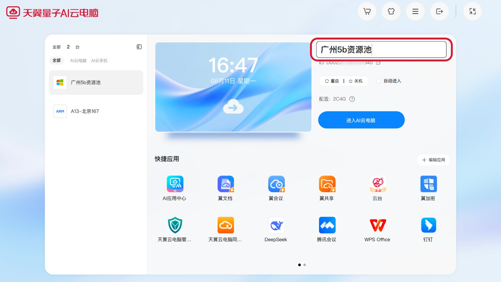 本节介绍天翼量子AI云电脑客户端中的AI云电脑与AI云手机管理操作。