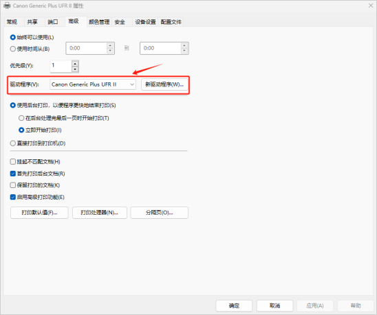 选择已经添加好的网络打印机实例,右键->打印机属性->高级,确认打印机所使用的驱动型号;如图所示在本地终端里佳能C3826这款打印机使用的打印机驱动为Canon Generic Plus UFR II。