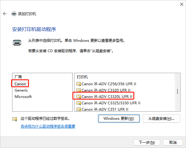 另有情况,如已知打印机型号为佳能C3320L则可以使用驱动Canon iR-ADV C3320L UFR II。