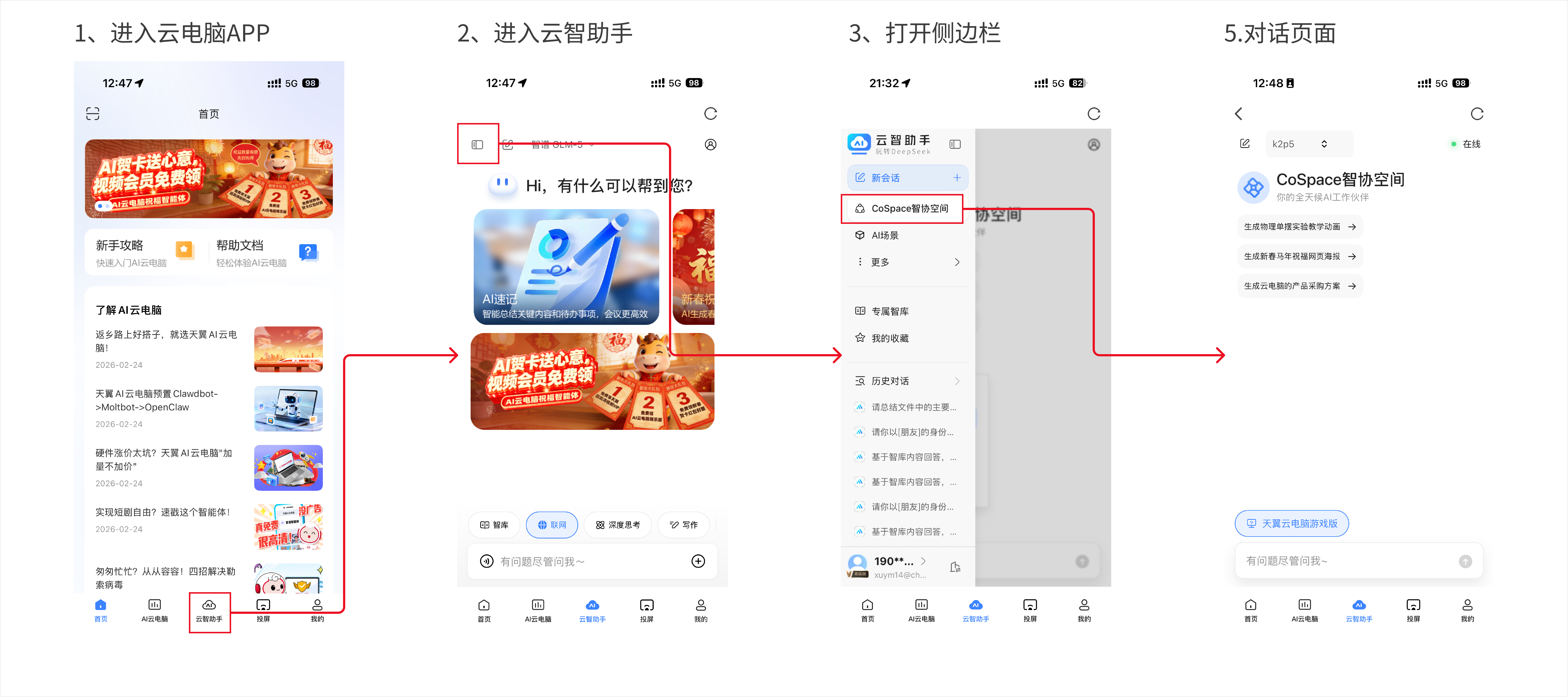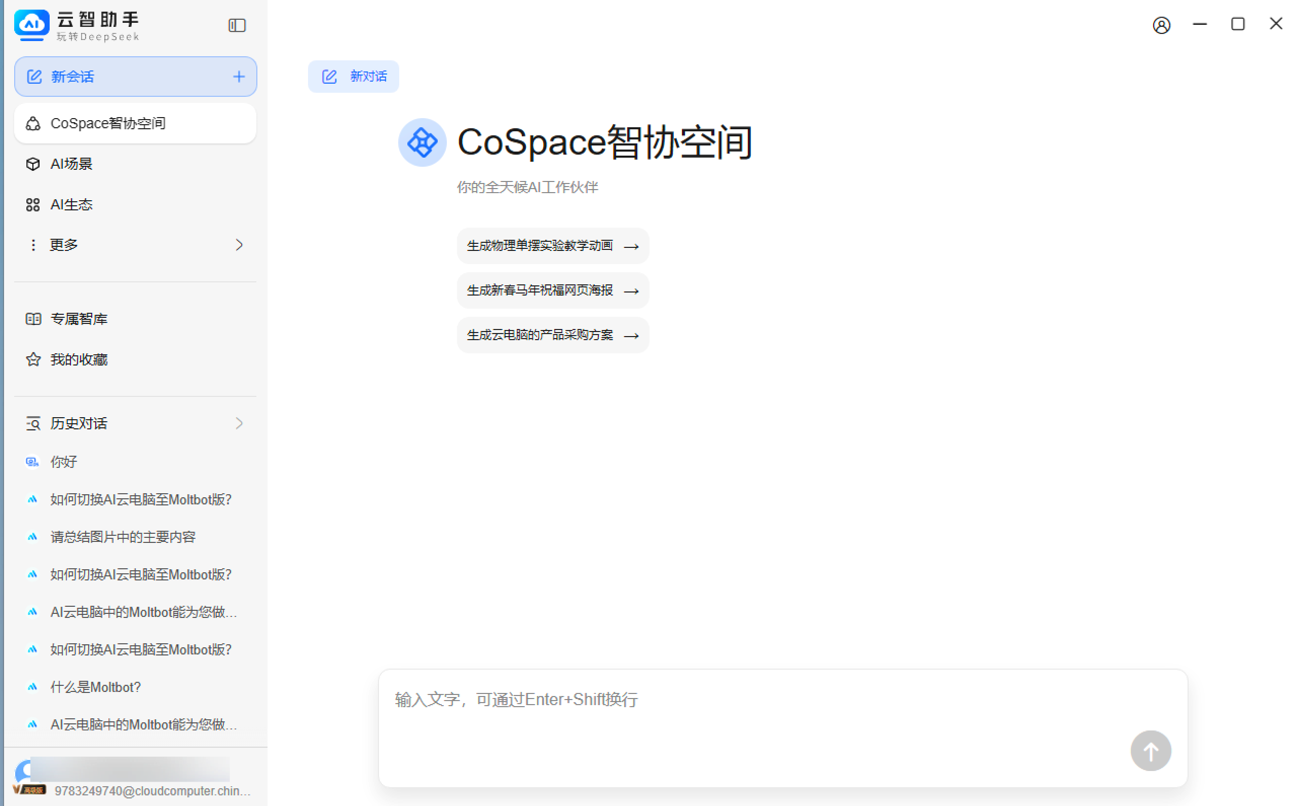 CoSpace是云智助手新增的AI云电脑桌面智能体功能,作为办公场景下的全天候AI工作伙伴,主打"一句话命令、跨终端远程智控云电脑"核心能力。用户无需额外下载,通过简单对话即可完成文件查找、办公软件操作、任务执行等复杂办公需求。