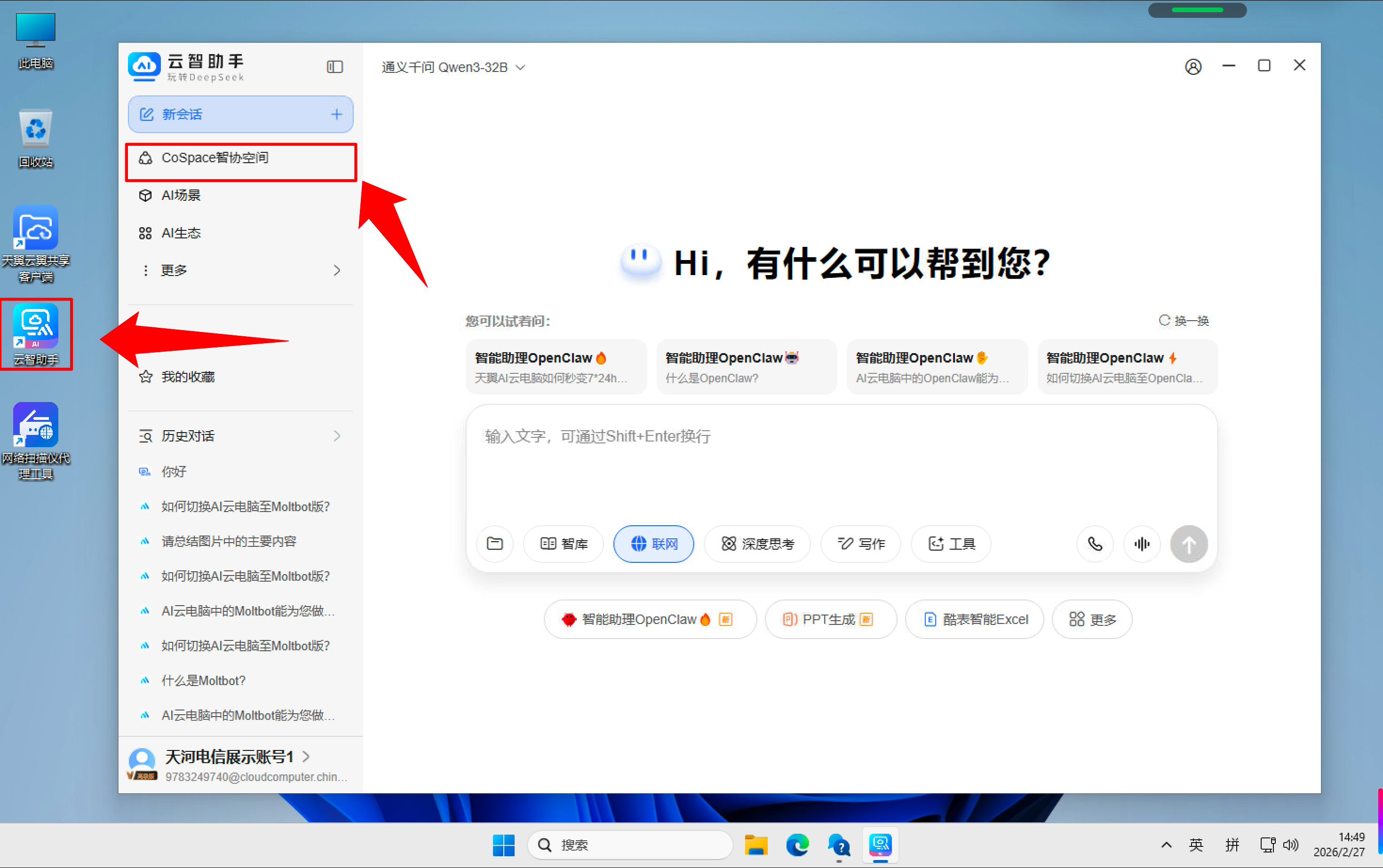 在专属镜像桌面中代开云智助手客户端,在侧边栏找到「CoSpace智协空间」入口;