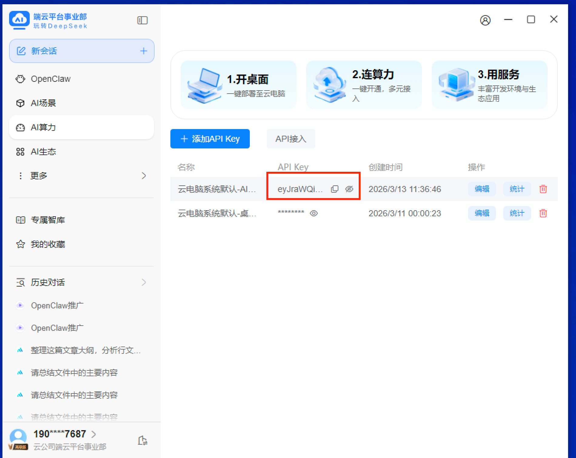 打开云智助手AI算力列表,查看当前账号的模型API Key;若无API Key,需按流程手动创建;