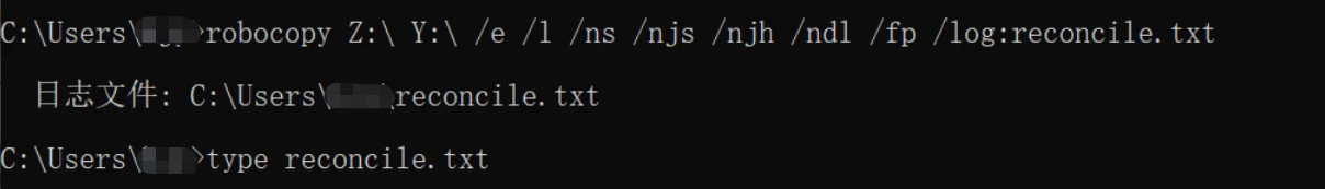 robocopy Y:\ Z:\ /e /l /ns /njs /njh /ndl /fp /log:reconcile.txt