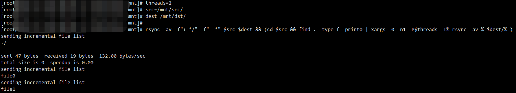 rsync -av -f"+ */" -f"- *" $src $dest && (cd $src && find . -type f -print0 | xargs -0 -n1 -P$threads -I% rsync -av % $dest/%)说明
