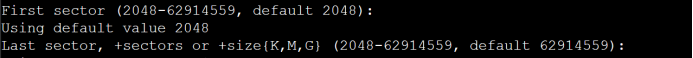 Last sector, +sectors or +size{K,M,G} (2048-62914559, default 62914559):