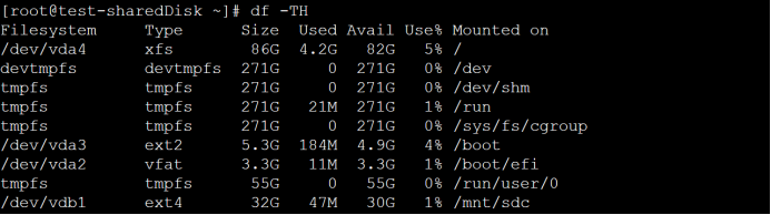 [root@test-sharedDisk ~]# mount /dev/vdb1 /mnt/sdc