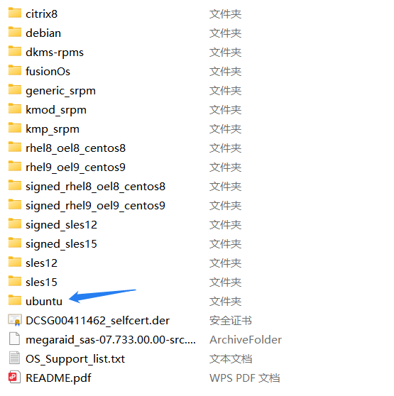 选择ubuntu目录下的MegaRAID SAS驱动安装包,本文示例驱动包为megaraid_sas-07.733.00.00-1dkms.noarch.deb。