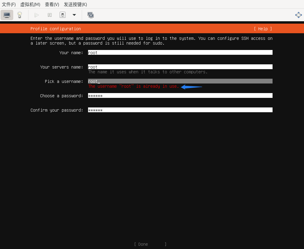 创建用户时只创建root用户即可,不建议新建其他用户,可能有安全隐患。物理机装机系统只在装机时为root用户设置密码,不考虑其他用户。这里输入的root密码只在虚拟机中可用。物理机装机时会设置root密码,进入物理机需要使用物理机装机时设置的root密码。