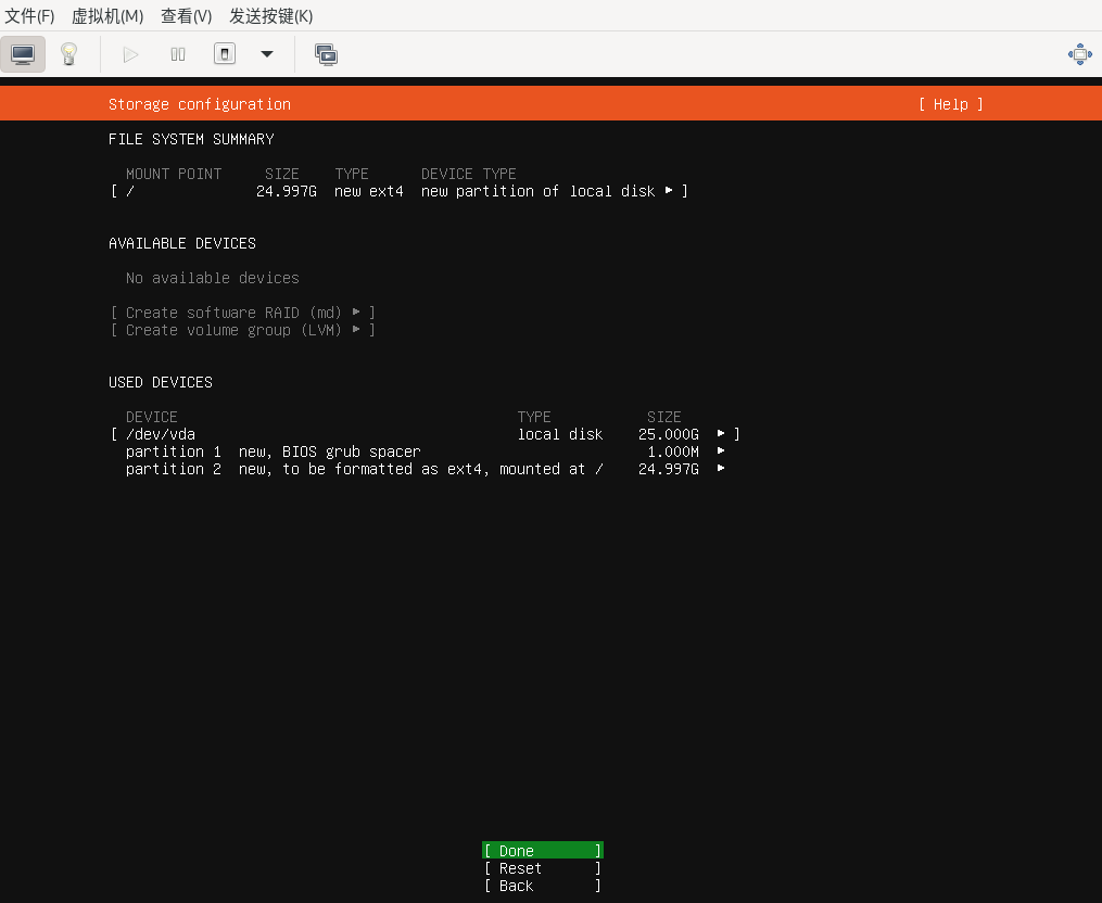 上面的截图时使用BIOS方式启动安装系统并自动分区得到的结果。如果选择UEFI方式启动,这里的自动分区结果稍有不同,如以下示例所示,会多一个/boot/efi分区。