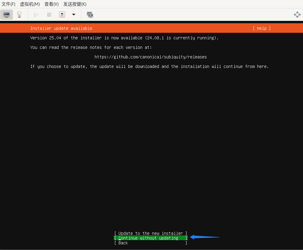 升级系统选项,选择“Continue without updating”,回车键确认。