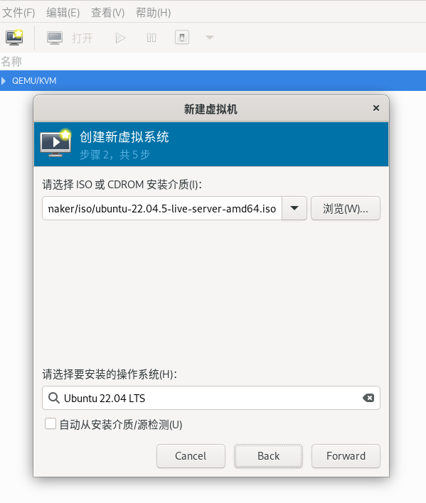 在“名称”文本框中输入虚拟机的名字,这个名字也会作为磁盘镜像的名字。磁盘镜像默认在/var/lib/libvirt/images/虚拟机名字.qcow2,后面转换镜像格式需要用到这个镜像,需要记下这个路径。这里名称我们使用“Ubuntu-22.04.5”。