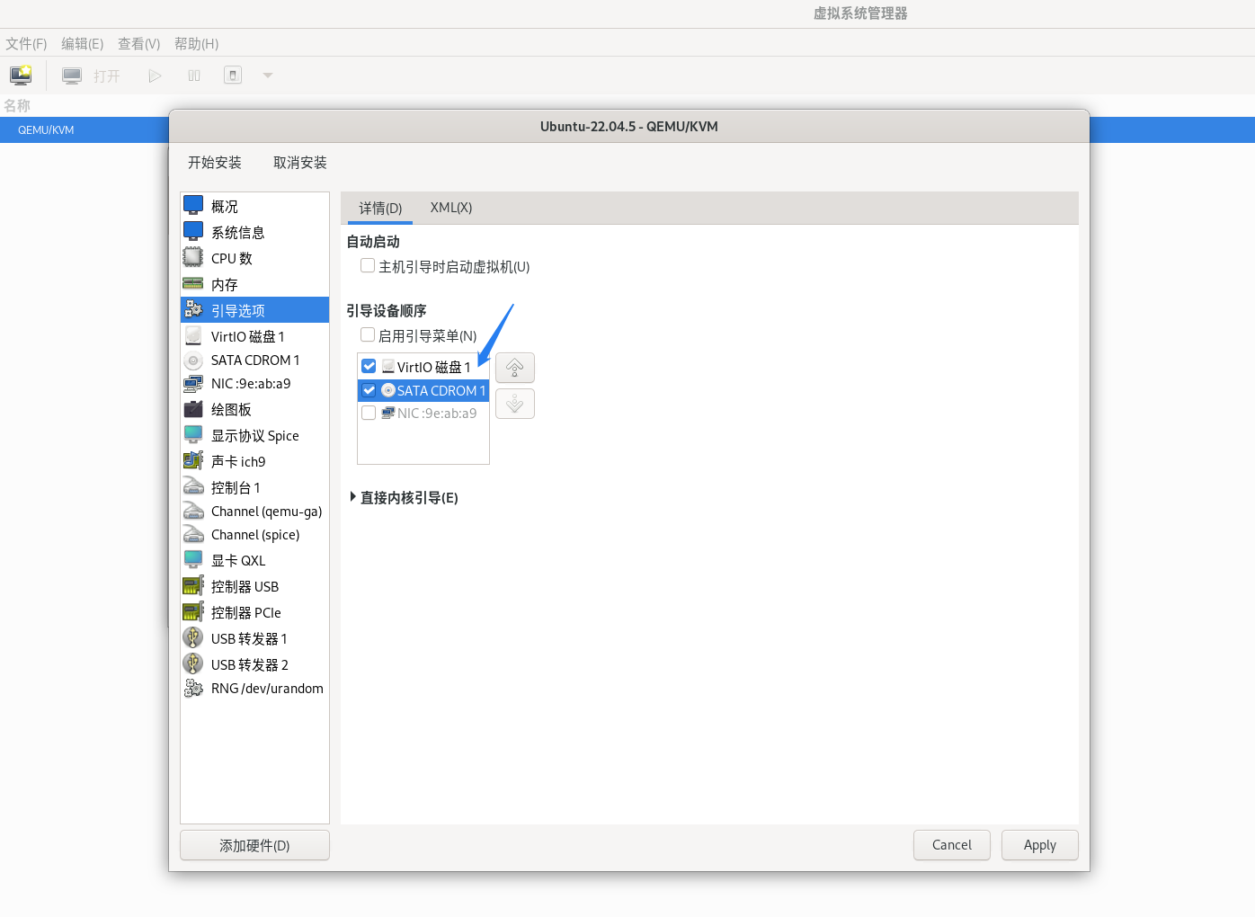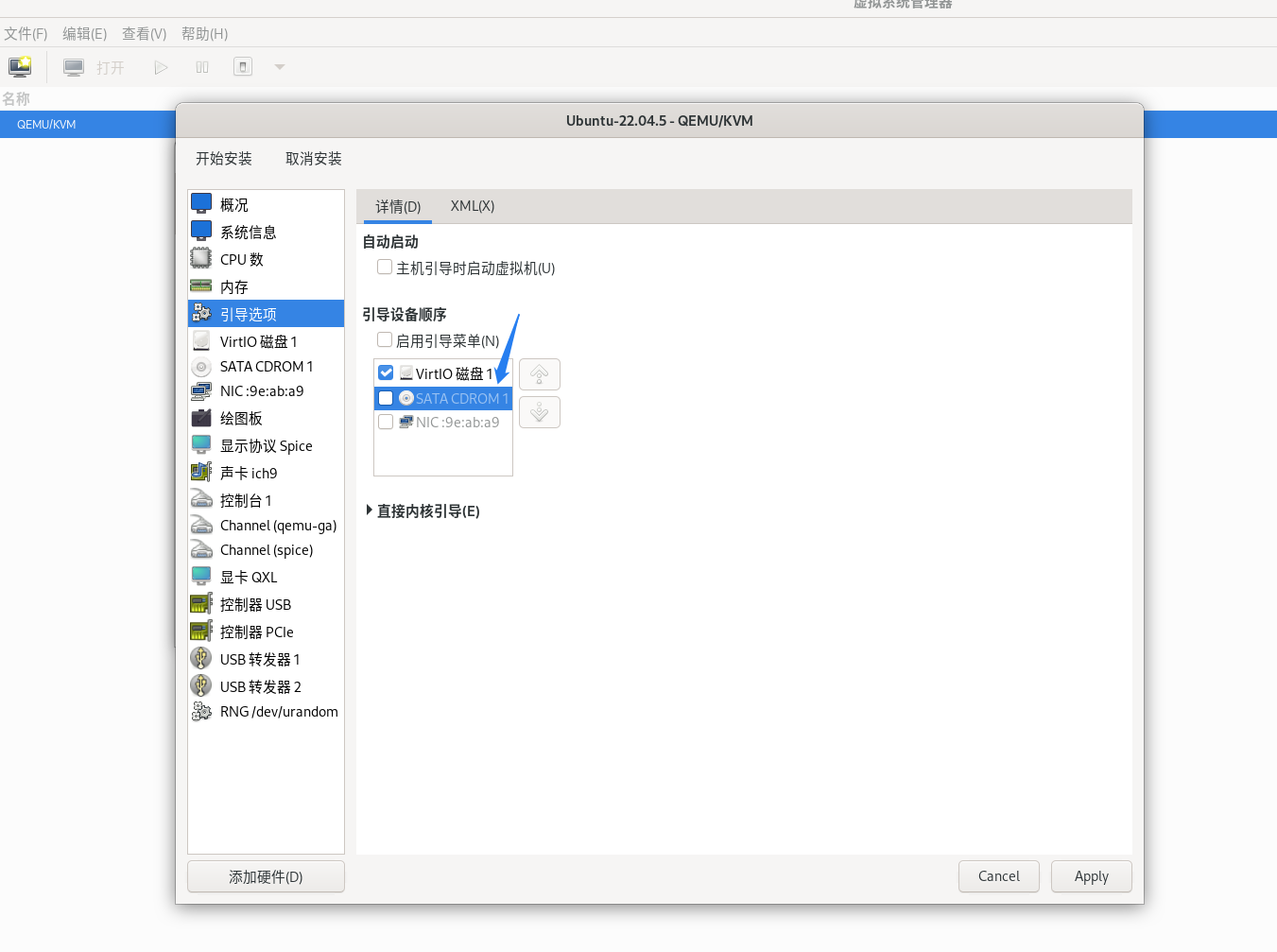 接下来修改启动顺序。在左侧选择“引导选项”,引导设备顺序从“VirtIO 磁盘1”改为“SATA CDROM 1”、“VirtIO 磁盘1”(勾选“SATA CDROM 1”,然后用右侧的上下箭头调整启动顺序)。点击右下角的“Apply”,保存配置。