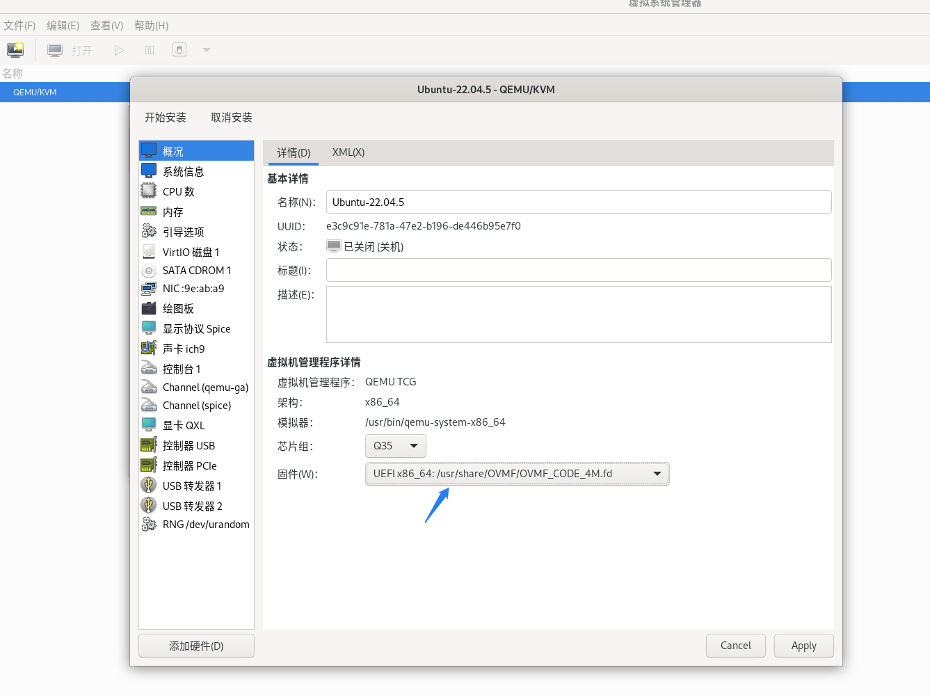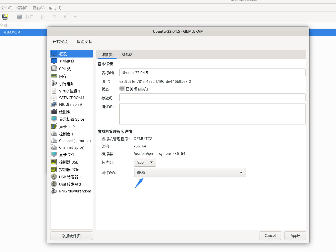 这时会有界面进行更细致的配置。在左侧选择“概况”,修改“固件”,从BIOS改为UEFI。点击右下角的“Apply”,保存配置。此时虚拟机支持的启动固件就从BIOS变为UEFI。
