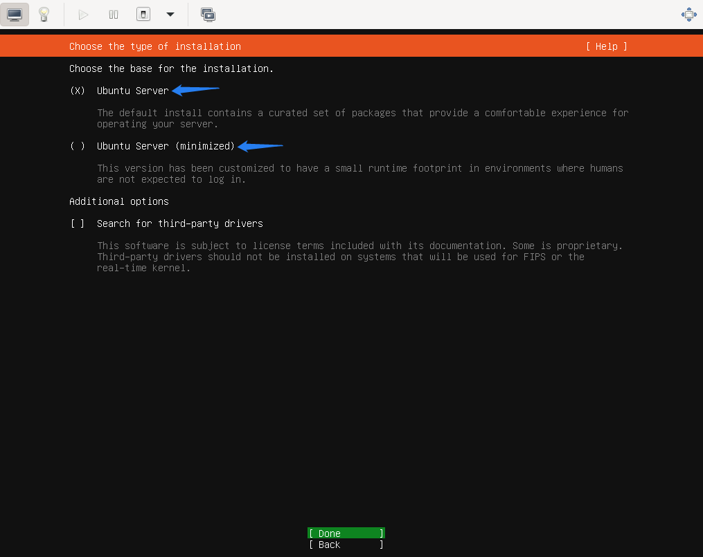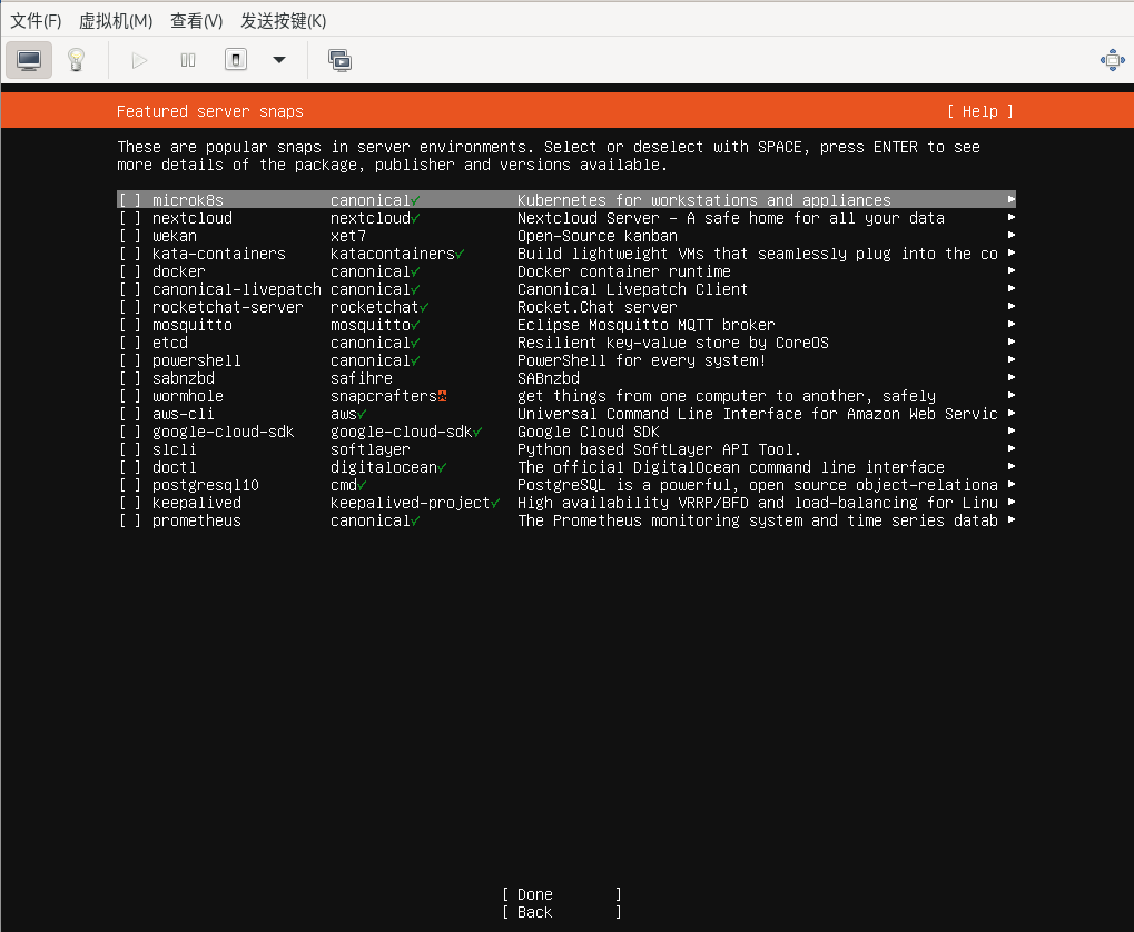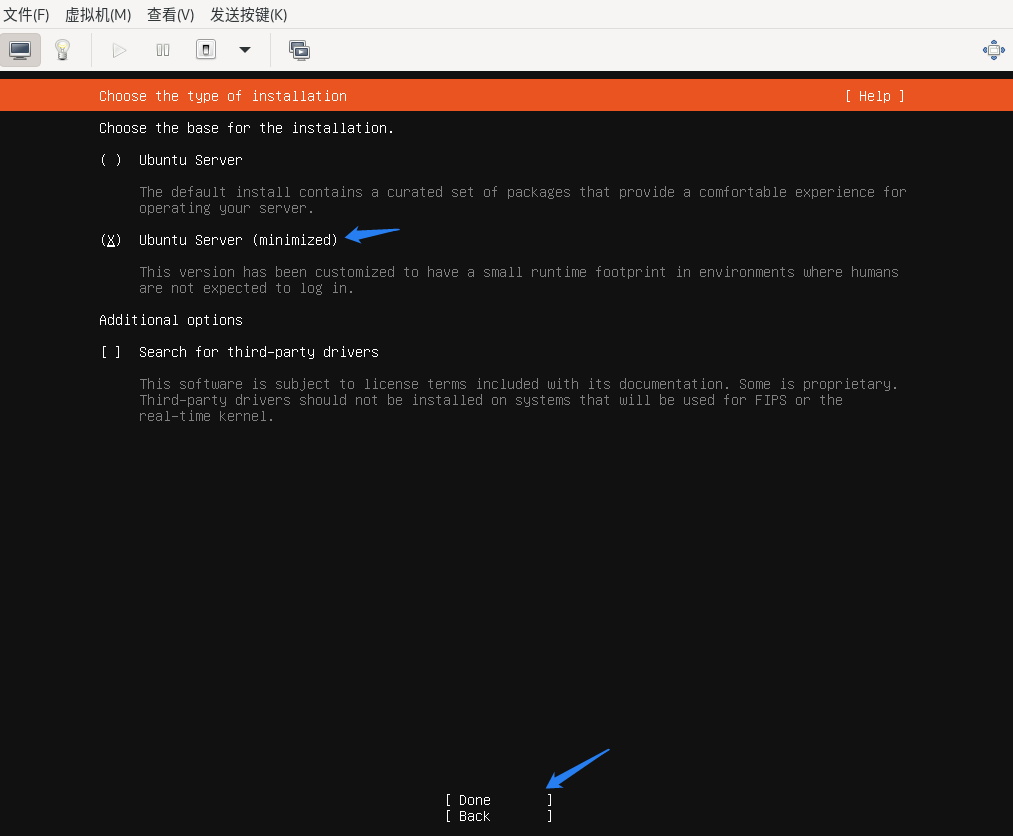 可选择标准安装‘Ubuntu Server‘或最小化安装‘Ubuntu Server (minimized)’,可根据需求选择其他选项,建议选择‘最小化安装‘Ubuntu Server (minimized)’,选择‘Done’后回车键确认。