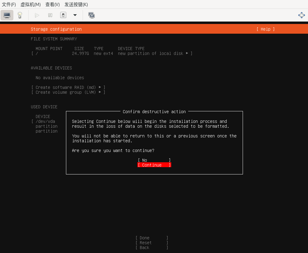 确认进行分区,选择‘Continue’,回车键确认。